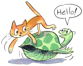 3. How did the girl and the dog and the bald guy and the cat get down there so fast? (Answer in the form of a wordless comic, with explanatory vector diagram if necessary.)